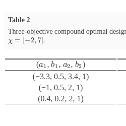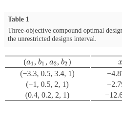 Extensions to constructing optimal designs for nonlinear models under 3 or more objective criteria using the Lagrange’s multiplier method were considered in [11]. For instance, if we have a 3 design criteria, we set $\lambda ={({\lambda _{1}},{\lambda _{2}},{\lambda _{3}})^{T}}$, each ${\lambda _{i}}$ is in $[0,1]$ and ${\textstyle\sum _{i=1}^{3}}{\lambda _{i}}=1$. The 3 objective compound optimal design ${\xi _{\lambda }}$ is then found by maximizing