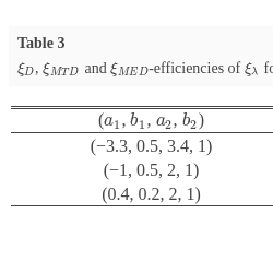 ${\xi _{D}}$, ${\xi _{MTD}}$ and ${\xi _{MED}}$-efficiencies of ${\xi _{\lambda }}$ for selected λ vectors.