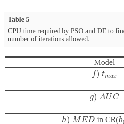 We now briefly compare performance of PSO with two other algorithms. We choose to compare CPU time required by PSO to find optimal designs with two of its competitors: Differential evolution (DE) and Cocktail algorithm (CA). Some of the models we used in the comparisons are listed in Tables 4 and 5. The compartment model is taken from [5] and it has 3 parameters and some of the interesting features to estimate were area under the curve (AUC), the time to maximum (${t_{max}}$) and the model parameters. The Hill model is the 4-parameter logistic model and the bivariable linear model has two additive factors. All have normally and independently distributed errors with constant variance. In the following tables, the numbers in parentheses are flocks size and the maximum number of iterations allowed for PSO and the single number in parentheses represents the number of points in the discretized dose interval