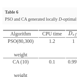 CA is a deterministic algorithm, which means that the same input results in the same answer, which in our case, results in the same optimal design. CA requires the design space to be discretized into a finite number of dose levels to approximate the continuous space. This approach can limit the ability of CA to find the optimal design because the discretized points may not correspond to a design point of the optimal design. However, our experience is that the CA-generated designs can usually still be highly D-efficient (with D-efficiency greater than $90\% $). In addition, we observe from Table 6 that the number of support points in the PSO-generated designs tend to be smaller that those generated by CA. Thus the simpler PSO-generated designs are attractive and also likely less costly to implement because of the fewer design points.