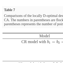DE is a metaheuristic algorithm like PSO, which is a general purpose optimization algorithm. We use it to find locally D-optimal design for models $(a)$ to $(e)$ in Table 4, and locally c-optimal designs for estimating the three quantities $(f)$ to $(h)$ in Table 5. In this section, we worked with known optimal designs and the generated designs by PSO, DE and CA are considered to be optimal when all their design points and their weights are the same as the known optimal designs rounded to the 4 decimal places.