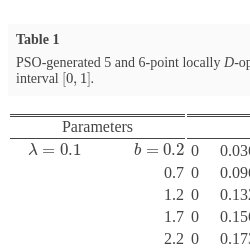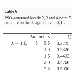 \[ \frac{b-(2b+1)u}{u(1-u)(b+u)}=\frac{\log (\lambda ){\lambda ^{2(1-u)}}}{1-{\lambda ^{2(1-u)}}}.\]We next use AlgorithmΒ 1 to systematically find the locally D-optimal exact designs. We used 256 particles and set the maximum number of iterations equals to 500. The PSO parameters ${c_{1}}$ and ${c_{2}}$ were set to their default values with both equal to 2. For the inertia weight, w, we started from 0.95 and linearly decreased it to 0.4 in the first 350 iterations and then fixed w as 0.4 for the remaining iterations. We implemented the algorithm and found PSO-generated D-optimal designs for several values of b and Ξ», i.e. $b=0.2,0.7,1.2,1.7,2.2,2.7$ and $\lambda =0.1,0.5,0.9$. We first consider the cases when the numbers of observations per subject were $m=2,3,4$ and a direct application of PSO shows the generated designs coincided with the analytical designs in [7] when $m=2$ and $b\ge 1/3$. The PSO-generated designs when we have 3 or 4 observations per subject also agree with those numerically found optimal designs from [7]. For space consideration, we do not display them. We next use AlgorithmΒ 1 to search for D-optimal designs when there are more observations per subject. TableΒ 1 displays the PSO-generated optimal exact designs for 5 and 6 observations per subject. Unlike the global numerical search approach in [7], we are not constrained by the grid size imposed on the experimental region, S, and PSO can still identify the best designs efficiently. The CPU time required by our AlgorithmΒ 1 to find the optimal design is short. On average, our MATLAB codes take around 4.11, 5.54, 6.72, 7.83 and 8.71 seconds to find the optimal designs when there are 2, 3, 4, 5 and 6 observations, respectively.