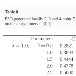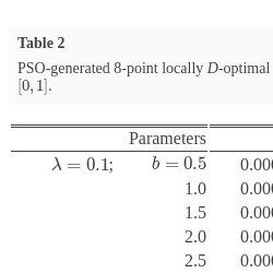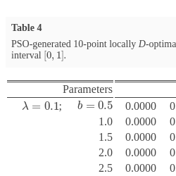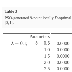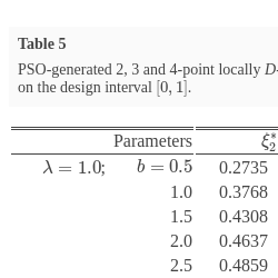 In summary, AlgorithmΒ 1 seems efficient for finding locally D-optimal exact designs for the Micahelis-Menten model. TablesΒ 2 to 4 show PSO-generated designs have more design points as the value of m is increased. To conserve space, we consider particular cases of ${(\lambda ,b)^{\top }}$ when Ξ» is fixed at 0.1, 0.5 and 0.9, and $b=0.5,1.0,1.5,2.0$ and 2.5.