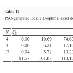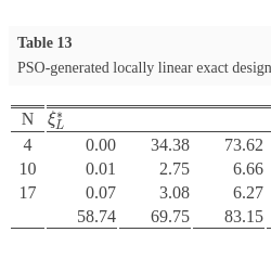 over all designs on the design interval. For the horse example, using the same set of nominal values, TableΒ 13 presents the PSO-generated L-optimal designs with $N=4,10$ and 17 observations.