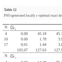 The search for the maximin design is a two-step task. First, for each value of $\theta \in \Theta $, where Ξ is a known set containing all plausible values of ΞΈ, we use PSO to find the locally c-optimal designs, ${\xi _{{W_{0}}}^{\ast }}$, ${\xi _{{W_{f}}}^{\ast }}$, ${\xi _{\Delta {W_{max}}}^{\ast }}$, ${\xi _{\langle \Delta W\rangle }^{\ast }}$ and ${\xi _{{t_{50}}}^{\ast }}$ for the five criteria. TableΒ 12 presents these locally c-optimal designs in the horse example for selected sample sizes of $N=4,10$ and 17. The c-optimal designs are then used in(4.5) to compute the C-efficiencies before using another PSO to search for the optimal maximin design, ${\xi _{MM}^{\ast }}$.