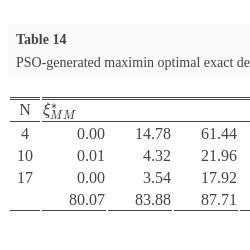 Recently a class of algorithms called nature-inspired metaheuristic algorithms has proved very popular in the optimization literature. [31,Β 32] provided reasons for the rapid rise and interest in these algorithms. Early users of such algorithms to find optimal exact designs for linear models include [12] who used an annealing algorithm to search for optimal designs for linear regression models, and [20] who used a genetic algorithm to construct exact D-optimal designs. Of particular note is the particle swarm optimization (PSO) introduced by [8] for tackling optimization problems. PSO is increasingly used across disciplines to solve hard optimization problems. PSO is essentially assumptions free and it searches in a simple and effective way. For example, unlike many algorithms, PSO does not require the objective function to be differentiable or convex and can solve non-convex high-dimensional optimization problems.