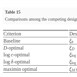 | Criterion | Design | D-eff. (%) | $\log c$-eff. (%) | $\log \delta $-eff. (%) |