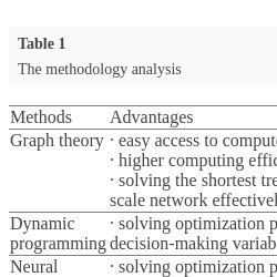 Minimum Spanning Tree Method (MSTM) and Dynamic Programming (DP) are the most commonly used solutions. MSTM abstracts pipeline network into undirected network, including classic solutions of Dijkstra Algorithms, Kruskal Algorithms, Steiner Algorithms (Graham and Hell, 1985). Compared to solutions of traditional graph theory, these algorithms adopt computer programs for processing, whose operation efficiency is relatively high, Steiner Algorithms effectively solve to the shortest path problem of large-scale network (Han and Lim, 2010; Sniedovich, 2006; Zhou, 2004). However, the above three algorithms do not consider investment costs of pipeline projects, whose results can be only regarded as the initial pipeline network layout. DP can deal the optimization problem of multiple decision-making variables, while ‘dimension obstacles’ exist in solving, that is computation will increase exponentially with growth of the number of variables. When the dimension of this problem increases to a certain degree, it cannot be solved (Bellman and Dreyfus, 2016). Through the above analysis, we can see that current commonly used methods have certain advantages and limitations, as shown in Table 1.