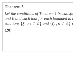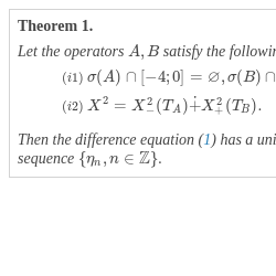 \[ \left\{\begin{array}{l}{\overline{\xi }_{n+1}}={\widetilde{T}_{A}}{\overline{\xi }_{n}}+{\overline{\eta }_{n}},n\ge 1,\hspace{1em}\\ {} {\overline{\xi }_{n+1}}={\widetilde{T}_{B}}{\overline{\xi }_{n}}+{\overline{\eta }_{n}},n\le 0,\hspace{1em}\end{array}\right.\]Let W be a complex Banach space. Suppose that the spectrum $\sigma (U)$ of the operator $U\in \mathcal{L}(W)$ satisfies the condition $\sigma (U)\cap S=\varnothing $. Let ${\sigma _{-}}(U)$ be the part of the spectrum $\sigma (U)$ lying inside the circle S and ${\sigma _{+}}(U)=\sigma (U)\setminus {\sigma _{-}}(U)$. In what follows, we will consider the case when ${\sigma _{-}}(U)\ne \varnothing $, ${\sigma _{+}}(U)\ne \varnothing $. Note that all the results obtained below are also true in the case when one of the sets ${\sigma _{-}}(U),{\sigma _{+}}(U)$ is empty, with obvious changes in the formulas obtained.