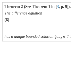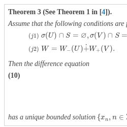 \[ \Bigg\{{u_{n}}={\sum \limits_{j=0}^{\infty }}{U_{-}^{j}}{P_{-}^{U}}{y_{n-1-j}}-{\sum \limits_{j=-\infty }^{-1}}{U_{+}^{j}}{P_{+}^{U}}{y_{n-1-j}},n\in \mathbb{Z}\Bigg\},\]Theorem 3 (See Theorem 1 in [4]).