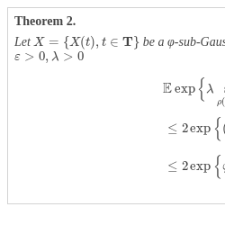 \[ \mathbb{E}\exp \Big\{\lambda \underset{t\in \mathbf{T}}{\sup }|X(t)|\Big\}\le 2Q(\lambda ,\theta ),\]