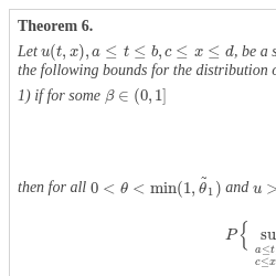The results on the distribution of supremum for the processes related to the heat equations with φ-sub-Gaussian initial conditions generalize the corresponding results from papers [13, 14] where sub-Gaussian initial conditions were considered. The results on the rate of growth under this setting was not stated before. Note that the results obtained in Section 4 hold also for Gaussian and sub-Gaussian case, with substitution $\varphi (x)=\frac{{x^{2}}}{2}$ in the corresponding bounds. Due to the use of Theorem 1, which is based on the entropy integral (2), for the Gaussian and sub-Gaussian case our bounds appear in the form which is simpler but somewhat different from the corresponding bounds in [13, 14]. We postpone for the future research the accurate comparison of these bounds, in particular, by simulation studies.