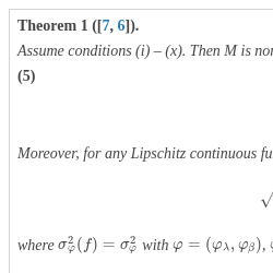 \[ \begin{array}{r@{\hskip0pt}l}\displaystyle \xi (Y,\varDelta ,W)& \displaystyle =\frac{\varDelta \cdot \varphi _{\lambda }(Y)}{\lambda _{0}(Y)}-\frac{\exp ({\beta _{0}^{\top }}W)}{M_{U}(\beta _{0})}{\int _{0}^{Y}}\varphi _{\lambda }(u)du+\varDelta \cdot {\varphi _{\beta }^{\top }}W\\{} & \displaystyle \hspace{1em}-{\varphi _{\beta }^{\top }}\frac{M_{U}(\beta _{0})W-\mathsf{E}[U{e}^{{\beta _{0}^{\top }}U}]}{M_{U}{(\beta _{0})}^{2}}\exp \big({\beta _{0}^{\top }}W\big){\int _{0}^{Y}}\lambda _{0}(u)du,\end{array}\]Theorem 1 ([7, 6]).