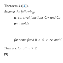where $\tilde{\varDelta }_{j}:=1-\varDelta _{j}$, $N(u):=\mathrm{\sharp }\{Y_{i}>u,\hspace{0.2778em}i=1,\dots ,n\}$, and $Y_{(n)}$ is the largest order statistic.We state the convergence of the Kaplan–Meier estimator. Remember that $Y=\min \{T,C\}$. Let $G_{Y}(t)$ be the survival function of Y.