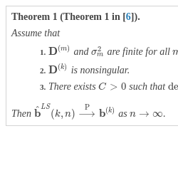 The following theorem provides conditions for the asymptotic normality and describes the dispersion matrix of the estimator ${\hat{\mathbf{b}}}^{\mathit{LS}}(k,n)$. Theorem 2 (Theorem 2 in [6]).