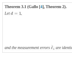 is a covariance matrix of errors for one observation. For every i, it is assumed that $\mathbb{E}{\tilde{c}_{i}}=0$ and $\mathbb{E}{\tilde{c}_{i}}{\tilde{c}_{i}^{\top }}=\varSigma $. The matrix ÎŁ is symmetric, positive semidefinite, nonrandom, and of size $(n+d)\times (n+d)$. It is assumed known when we construct the TLS estimator.
