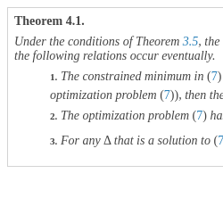 2.âLet ${\Delta _{\min \text{(12)}}}$ minimize (12), so the constraints are compatible. Then ${\Delta _{\mathrm{em}}}$ minimizes both (7) and (11), see Proposition 7.6. Thus,