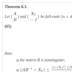 \[ \underset{m\times n}{{A_{0}}}\cdot \underset{n\times d}{{X_{0}}}=\underset{m\times d}{{B_{0}}}.\]Rewrite the relation in an implicit form. Let the $m\times (n+d)$ block matrices ${C_{0}},\widetilde{C},C\in {\mathbb{R}}^{m\times (n+d)}$ be constructed by binding ârespective versionsâ of matrices A and B: